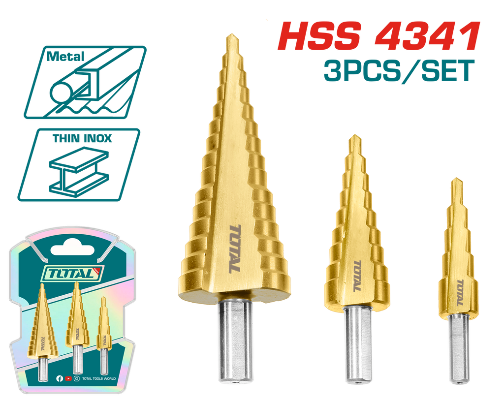 3 Pcs step drill bit set Material:HSS4341 1pcs 4-12mm,2mm/step,Shank diameter:6mm 1pcs 4-20mm,2mm/step,Shank diameter:8mm 1pcs 4-32mm,2mm/step,Shank diameter:10mm Packed by double blister