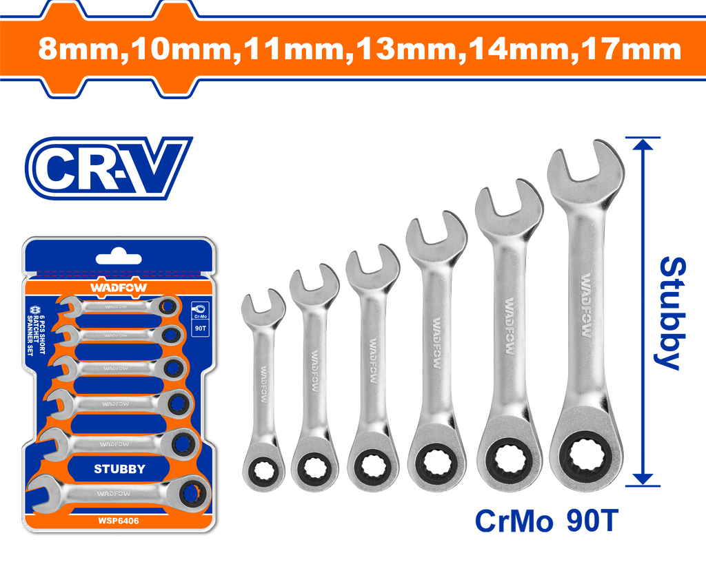 6 pcs Short ratchet spanner set90 TeethSize: 8-17mmDrop forged steel 8,10,11,13,14,17mmMaterial: Cr-VFine polishedPacked by double blister