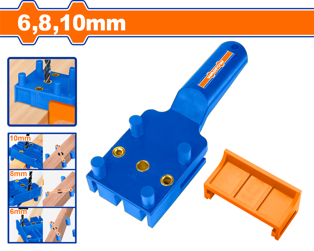 Size:6,8,10mm Material:ABS+PC Works with 12mm-26mm thick lumber Metal bushings with heat treatment Adjustable fence Working for wood drilling precise Packed by color box