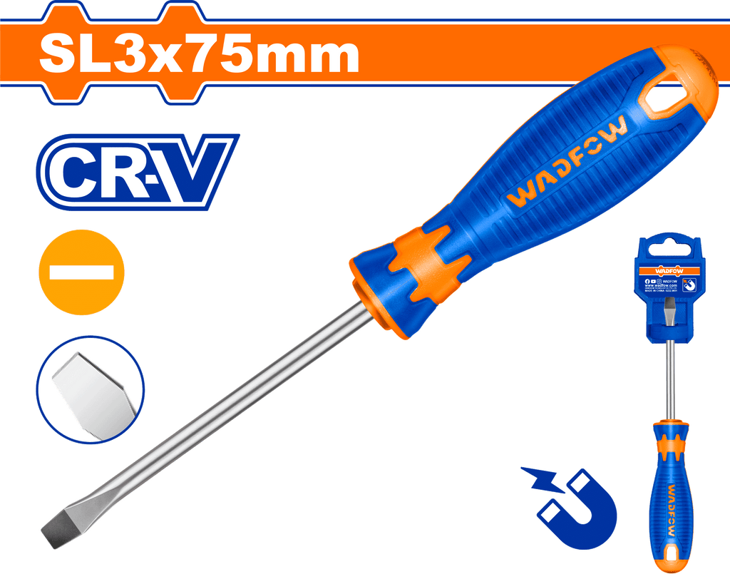Tip type: slotted Tip size: 3.0mm Round shank Diameter: 3.0mm Length: 75mm Material: Cr-V steel Magnetised tip Comfortable soft grip handle Packed by plastic hanger