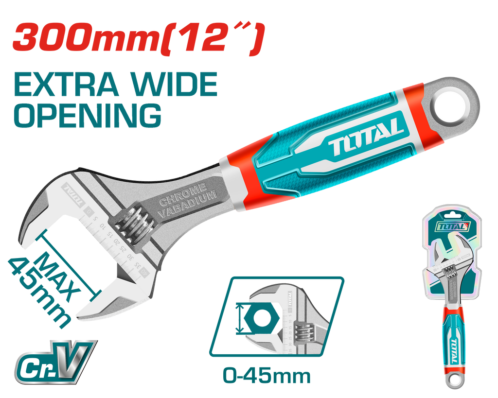 Unique design Handle Length:300mm(12"),CrV Adjustable clamp size:0-45mm Two color rubber handle Packed by double blister