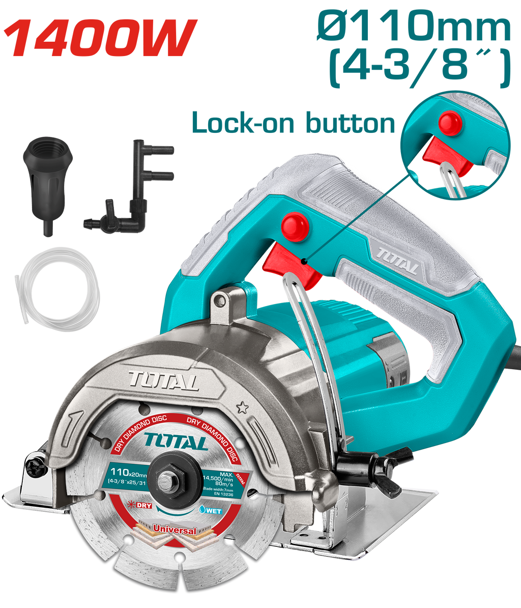Voltage:220-240V~50/60Hz Input power:1400W No-load speed:13000rpm Diameter of blade:110x20mm Max.cutting capacity:34mm Adjustable cutting depth Include 1pcs dry diamond disc Packed by color box