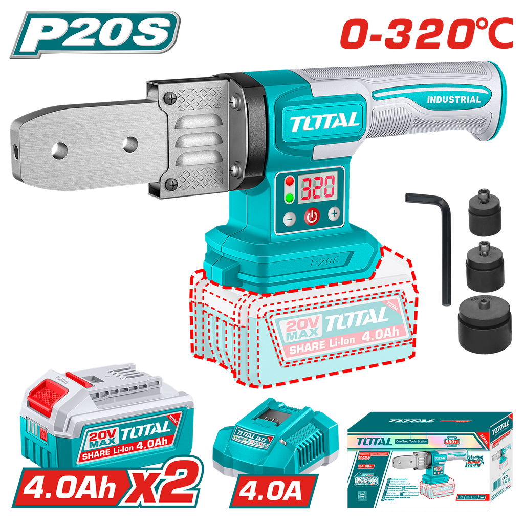 Voltage: 20V Rated temperature: 0-320℃ Clamping size: 20mm,25mm,32mm Include: 3 Pcs replacement heads 1 Pcs Hex key 2 Pcs 4.0Ah battery pack(TFBLI20021) 1 Pcs charger(TFCLI20411) Charge volts:220V-240V~50/60Hz Packed by color box