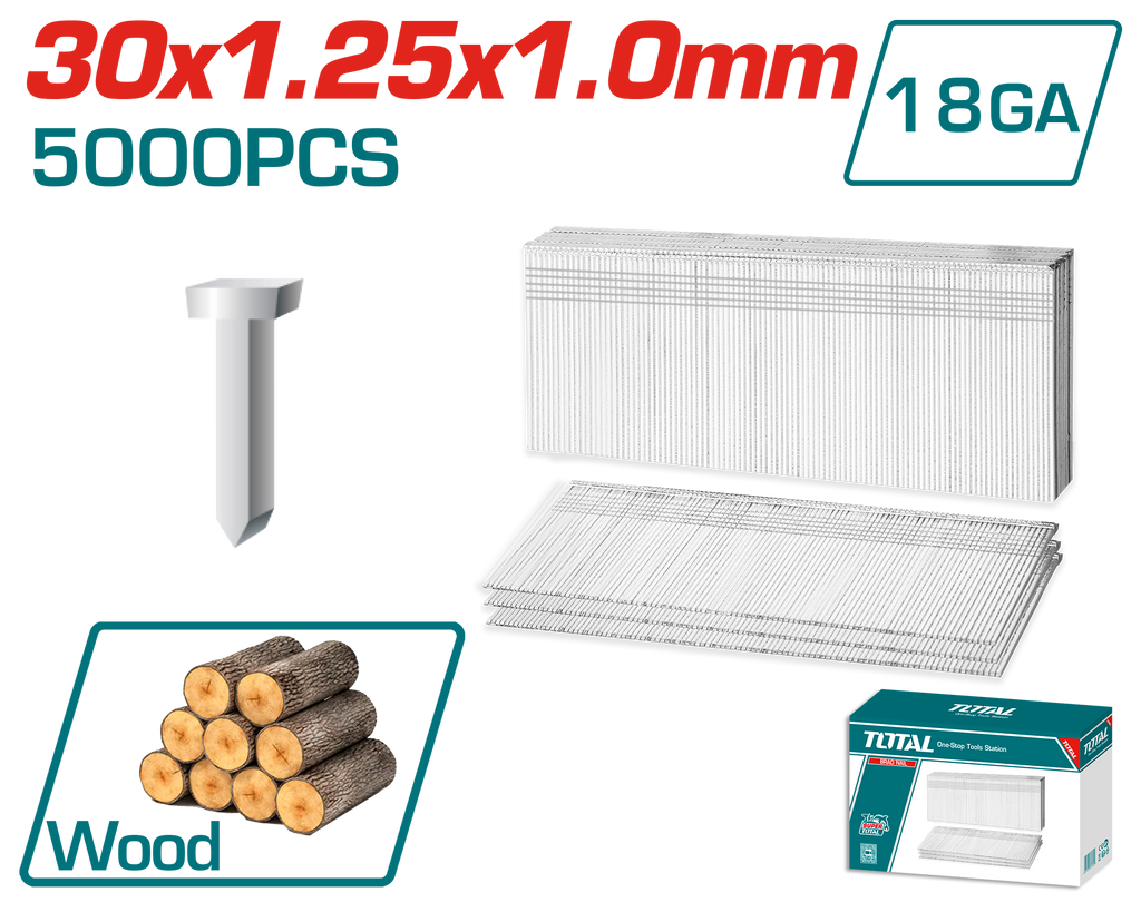 طول المسامير : 30 مم5000 قطعة/العلبة مناسب للدباسات : TAT81501، TAT83501، TAT83301، TAT83301-3، TCBNLI2005، TCBNLI2008، TCBNLI5005، TCBNLI5008المقاس : Ga18 ، 1.25 × 1.0 مممعبأ في علبة ملونة