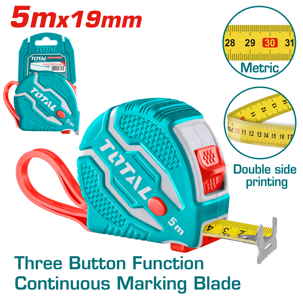 الطول والعرض : 5 متر × 19 مم نظام القياس : مترى فقط مزود بوظيفة 3 أزرار للإيقاف مزود بغطاء مطاطي مُعبأ على علاقة بلاستيكية